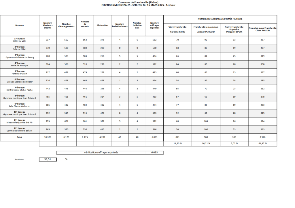 Le premier tour des élections municipales a eu lieu ce dimanche 15 mars. Vous étiez 6 175 à vous déplacer dans les 12 bureaux de vote de Francheville. Soit un taux de participation de 59,51%.