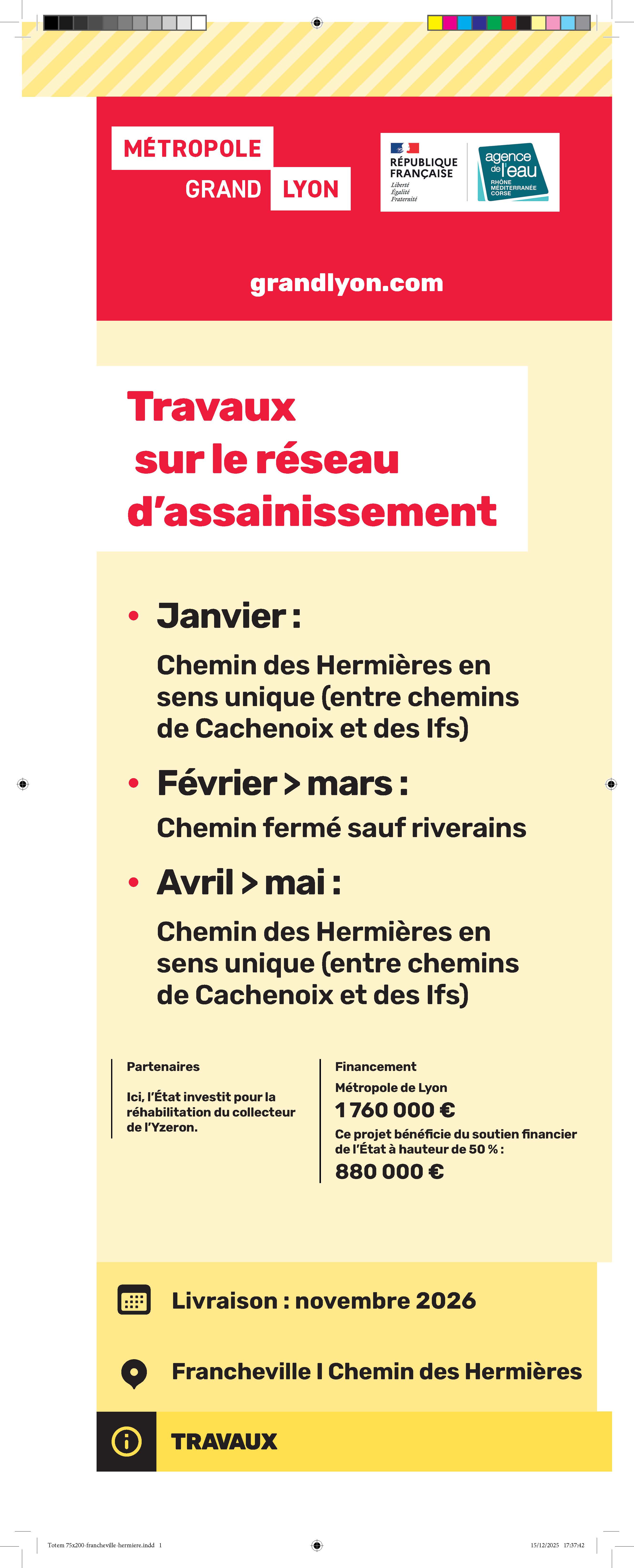 Des travaux d’aménagement vont être réalisés sur le chemin des Hermières à partir du 12 janvier, pour une durée couvrant l’ensemble du 1er semestre.